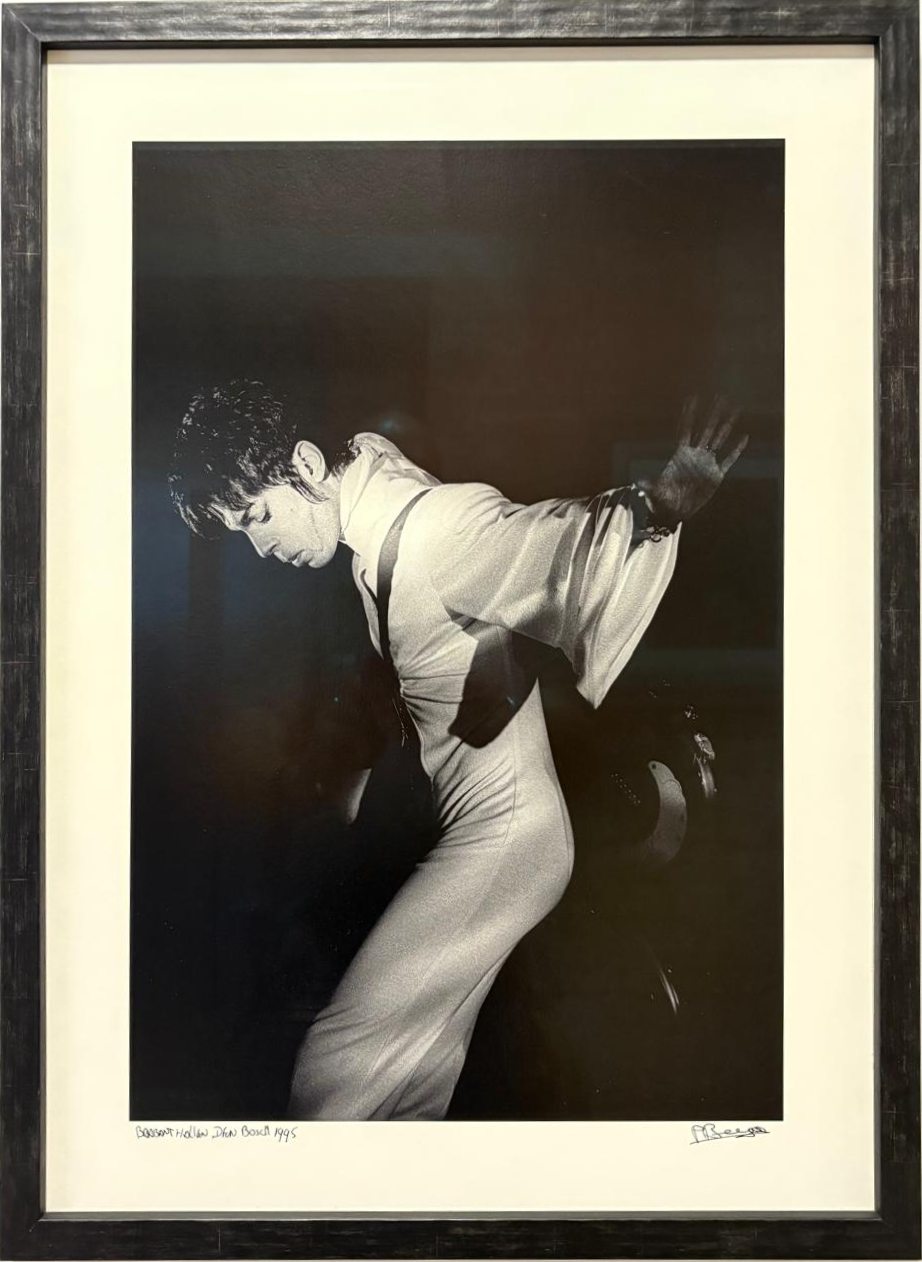 Photo of Prince taken on stage during sound check before show in mid 90’s, one off print made by the photographer working on the show for a private collector. New Black & Silver Metallic Moulding, slightly distressed, 2.cm square frame, 66cm by 54cm